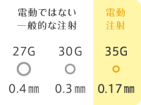 注射の針が太いと刺入部位に負荷がかかってしまい痛みにつながるため、当院では電動注射だからこそ安定して使用できる極細の針を採用しています。細さは35G(0.17mm)で、ワクチンや糖尿病の方の定期接種の針よりも細いです。